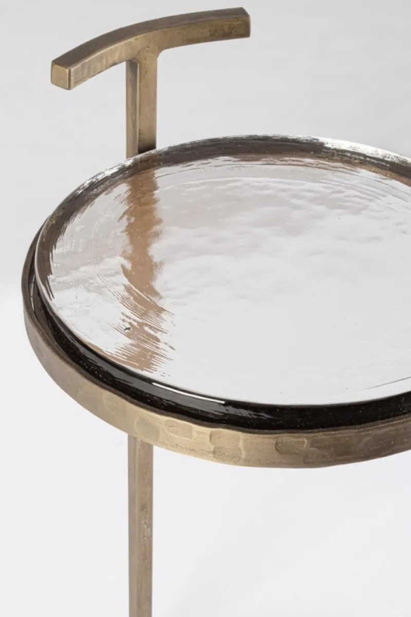 ACCIAIO CON FINITURA MARTELLATA, PLACCATA ED ANTICATA. PIANO IN VETRO NATURALE LAVORATO A MANO (SPESSORE 15-18MM). LE FORME ORIGINALI CREATE DAL VETRO SONO SOLO INDICATIVE, TUTTI I PRODOTTI SARANNO DIVERSI L’UNO DALL’ALTRO, CON MISURE E COLORAZIONI LEGGERMENTE DIFFERENTI.